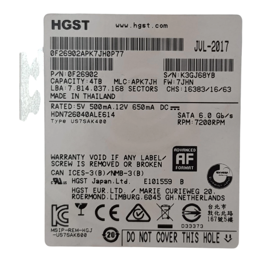The HGST 4TB 3.5" SATA Enterprise HDD (P/N 0F26902, Model HDN726040ALE614) is designed for high-performance and high-reliability environments. Each drive delivers 4TB of storage capacity with a 7200 RPM spindle speed and 6Gb/s SATA interface, ensuring fast access to large datasets.