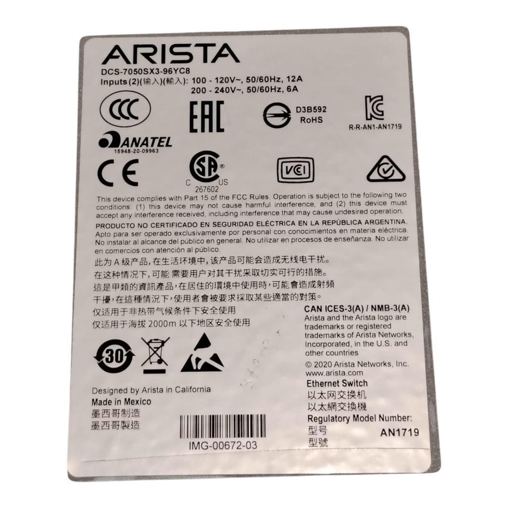 Certified by global compliance standards (FCC, CE, CSA, ANATEL, VCCI, RoHS), the DCS-7050SX3-96YC8 guarantees reliable, safe, and energy-efficient operation. Designed in California and manufactured in Mexico, it embodies Arista’s enterprise-grade build quality and innovation.