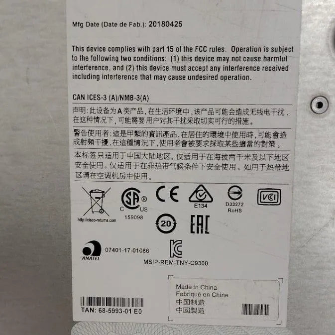 Certifications | MSIP-REM-TNY-C9300, UL E187300, Anatel, CE, CSA |