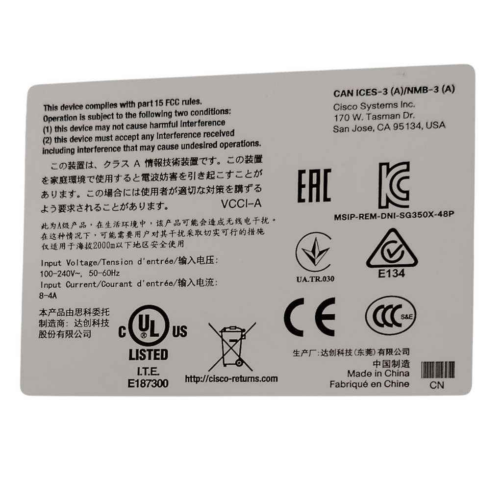 Certification Codes | MSIP-REM-DNI-SG350X-48P, UL Listed E187300 |