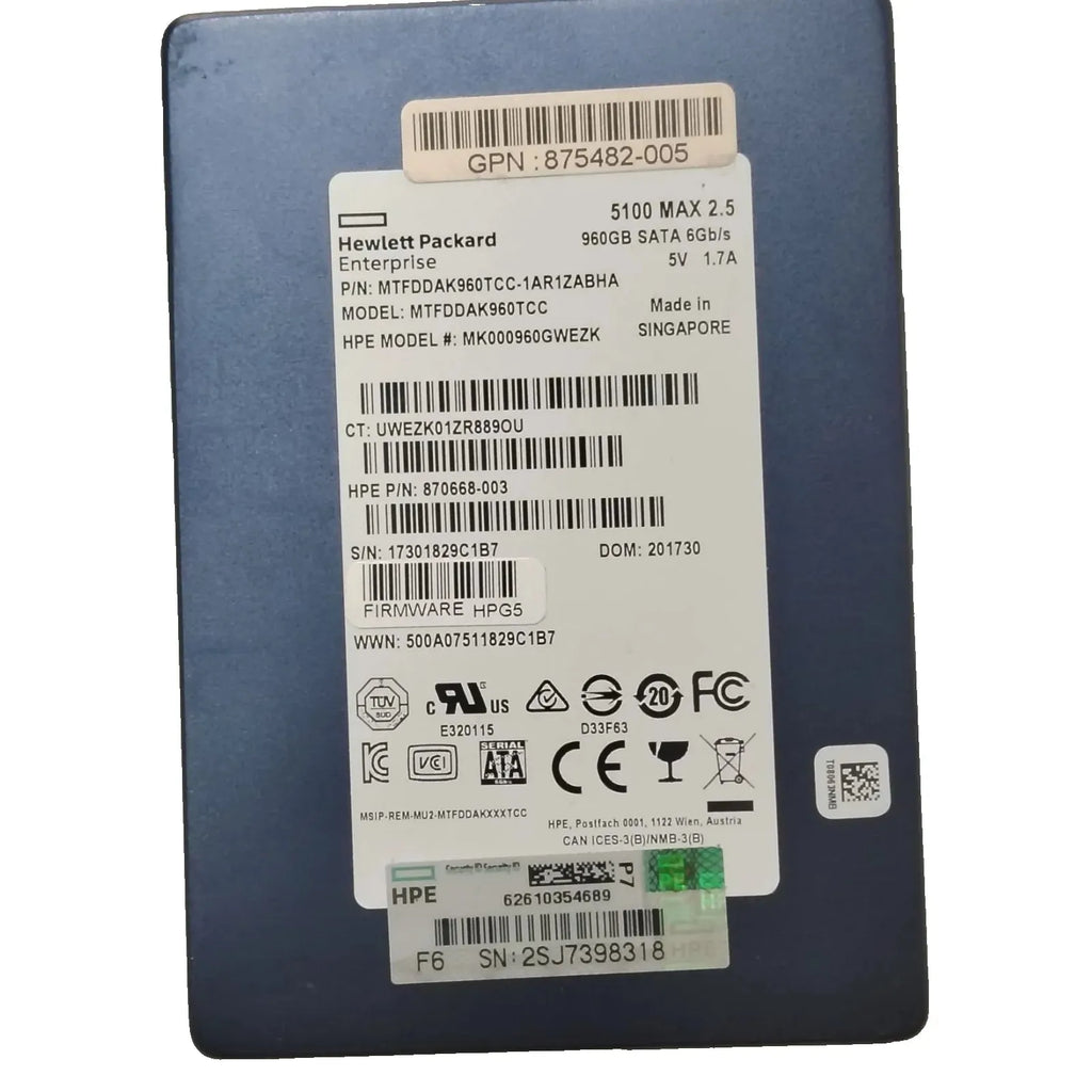 HP 960GB SATA 6Gb/s 2.5" Enterprise SSD MTFDDAK960TCC (870668-003). Reliable storage for HP ProLiant servers & enterprise workloads.