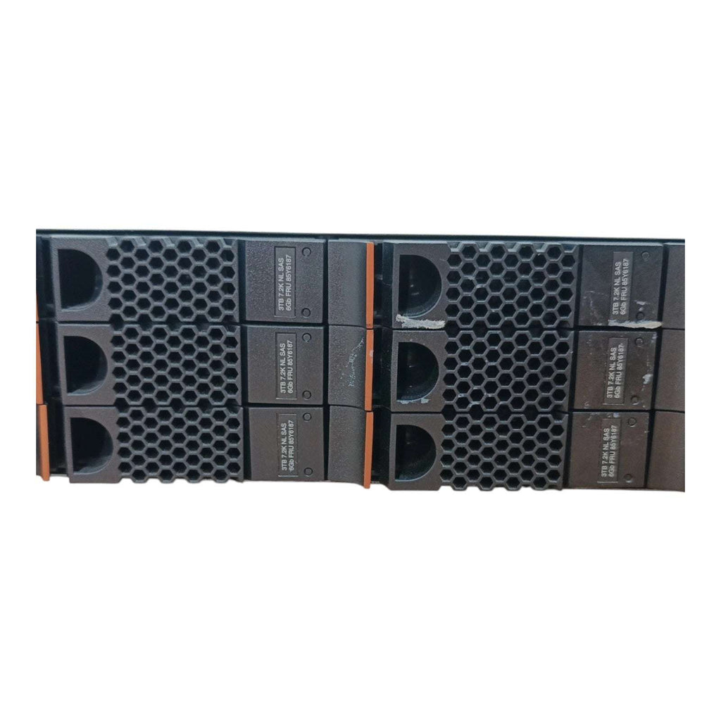 IBM 2076-212 2U storage expansion enclosure with 10 × 3TB SAS HDDs, dual ESM controllers, SAS connectivity, and redundant 580W power supplies.