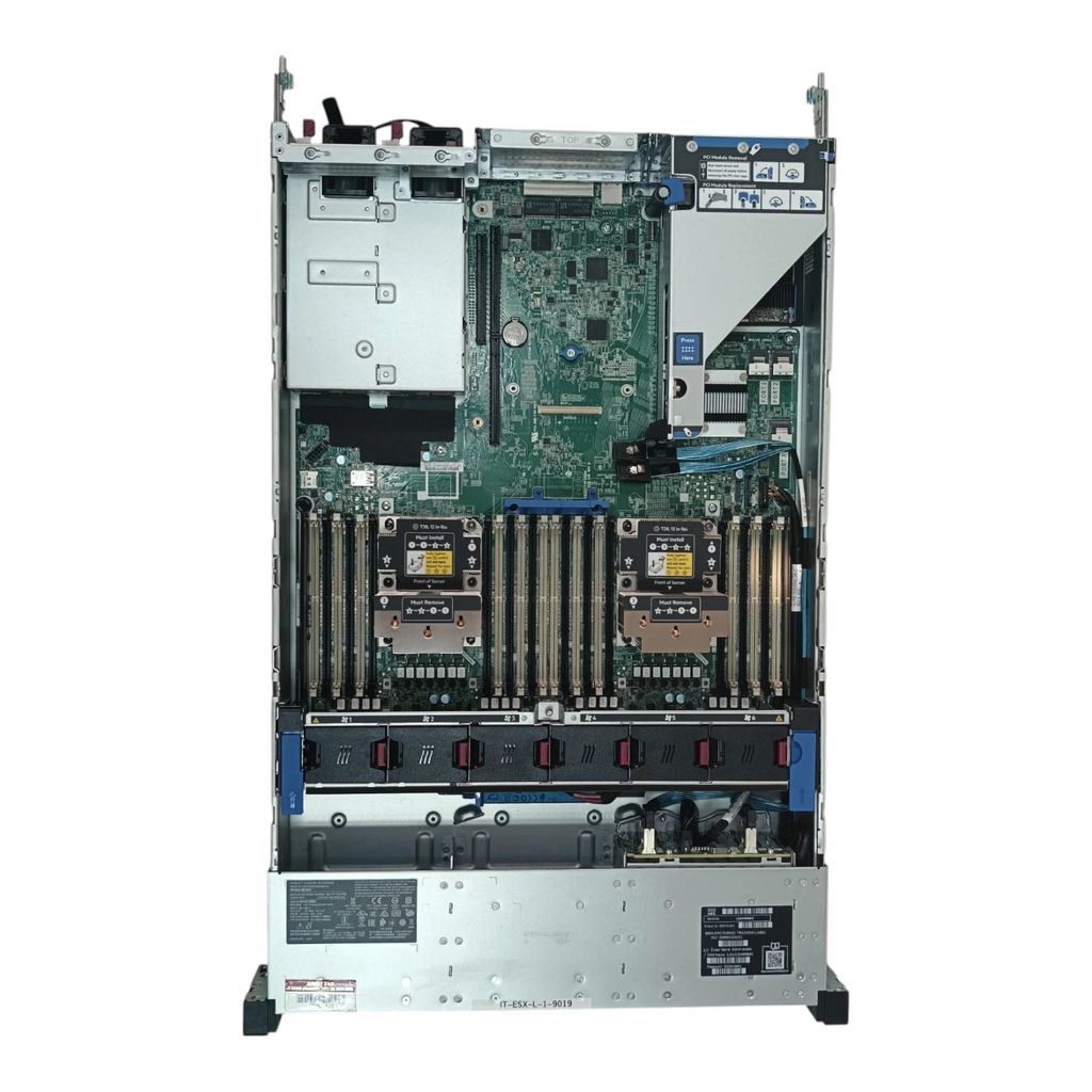 It comes equipped with key components: a 10Gb dual-port Ethernet adapter, primary PCIe riser card, two high-efficiency heatsinks, and dual 800W Platinum hot-swap power supplies. Combined with the HPE iLO (Integrated Lights-Out) management system, it ensures efficient monitoring, remote management, and uptime stability.