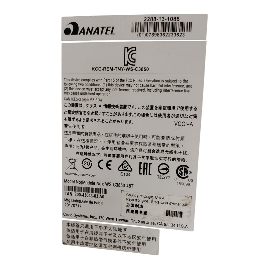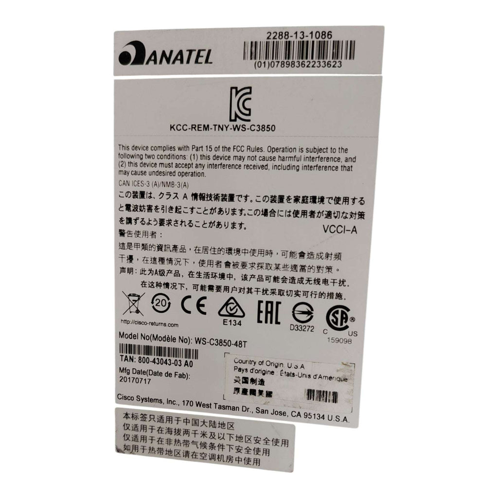 Cisco WS-C3850-48T-L Catalyst Switch with 48x Gigabit ports, Layer 3 LAN Base, stackable scalability & enterprise security. Reliable networking solution.